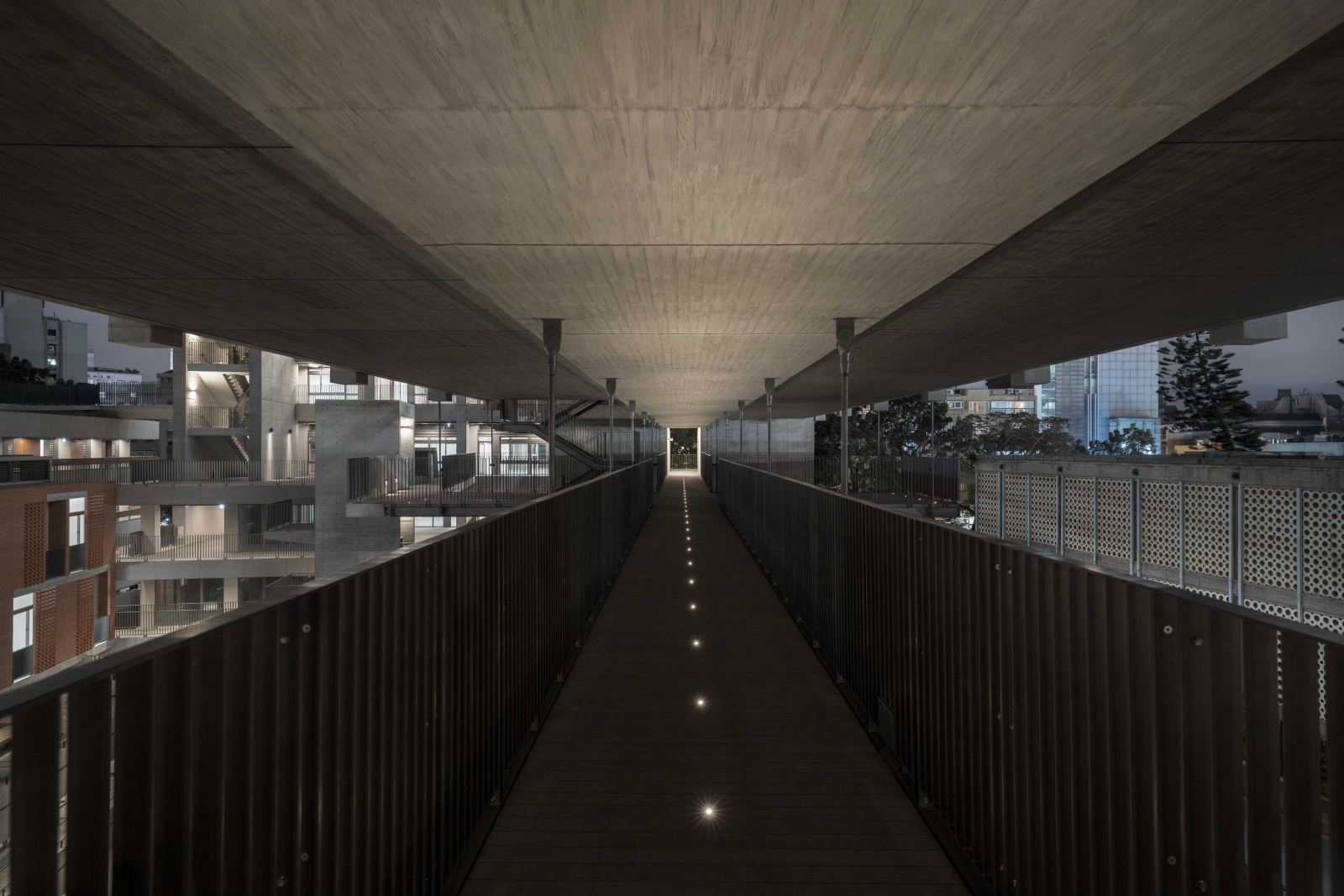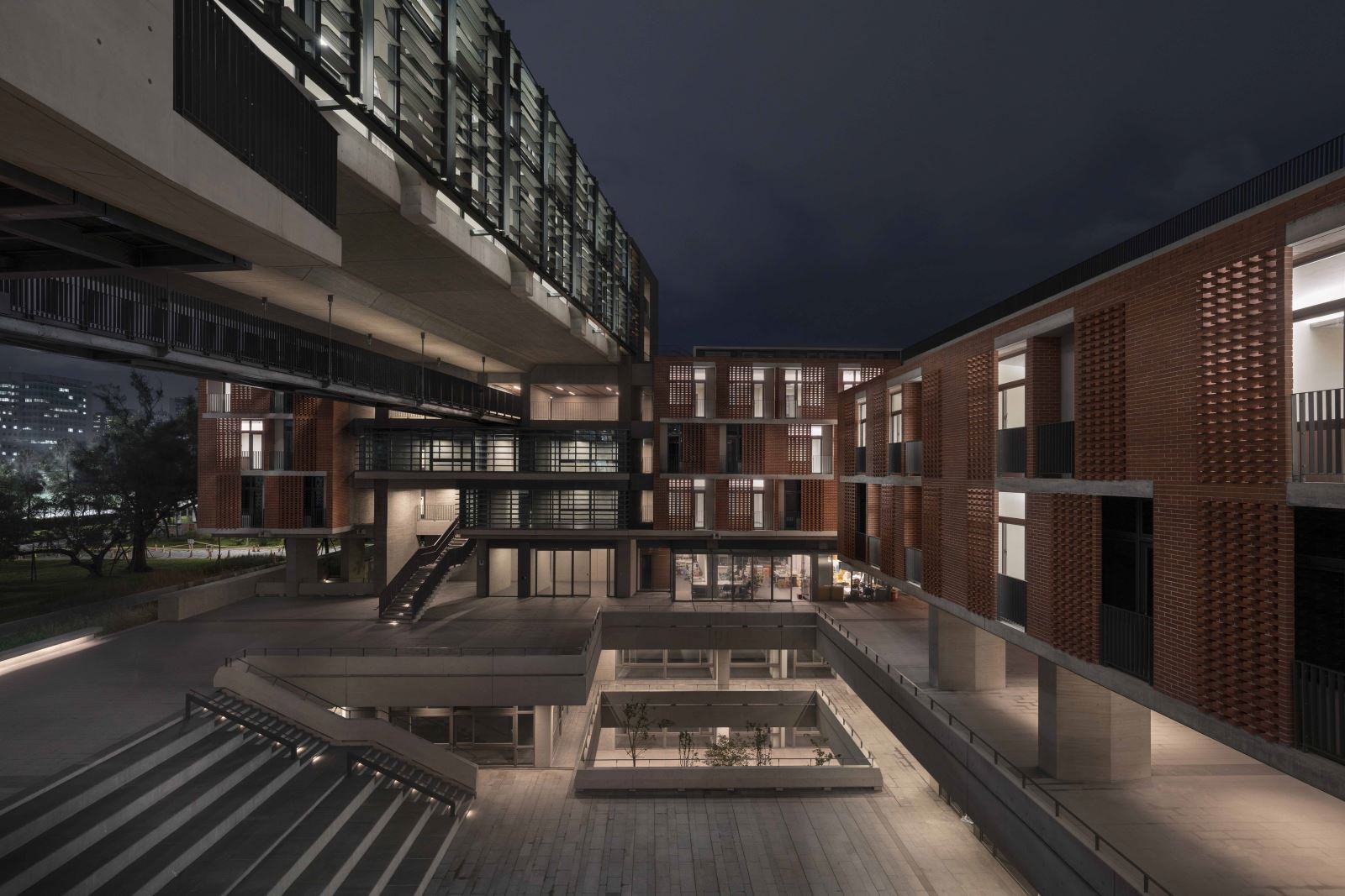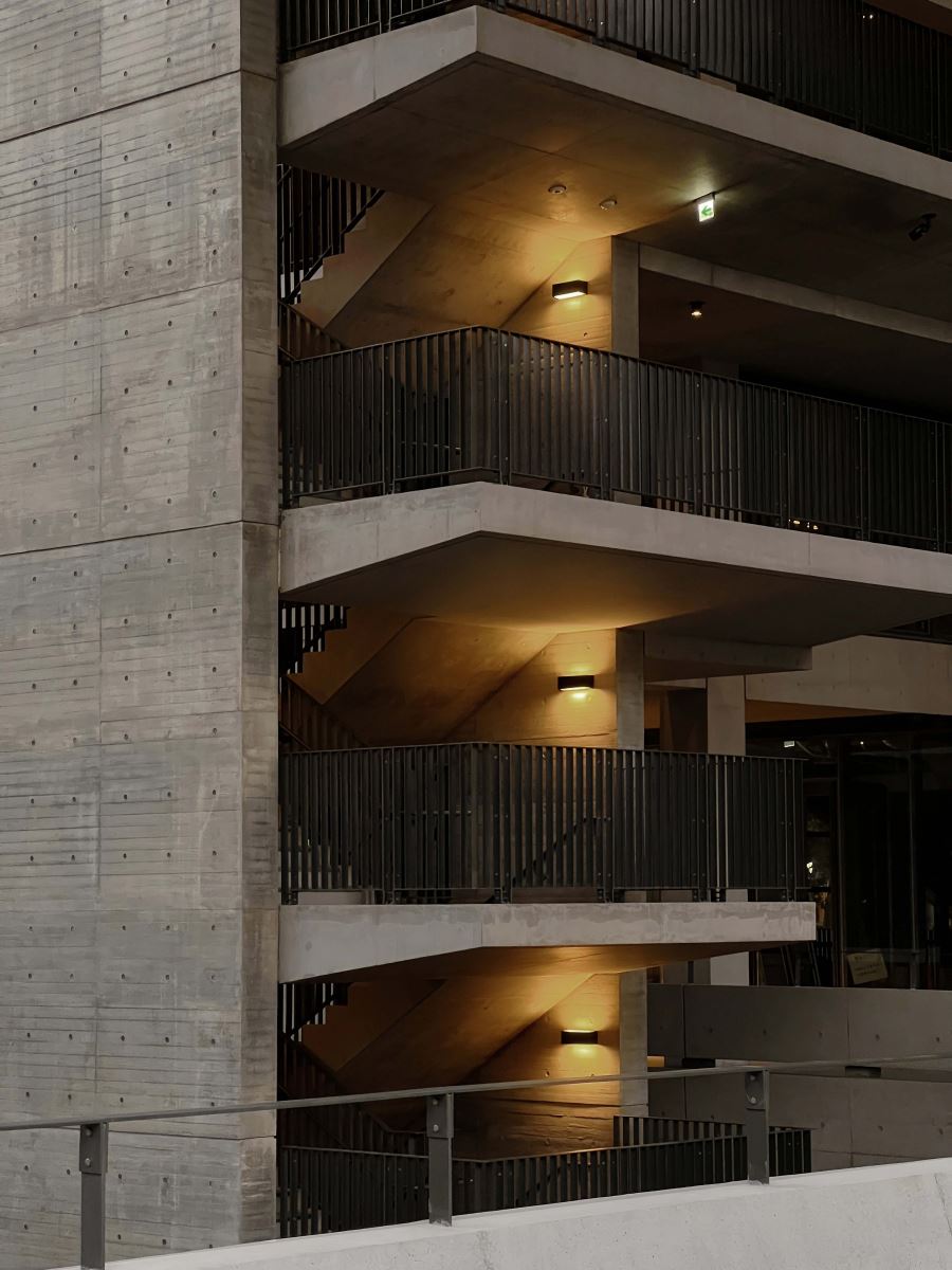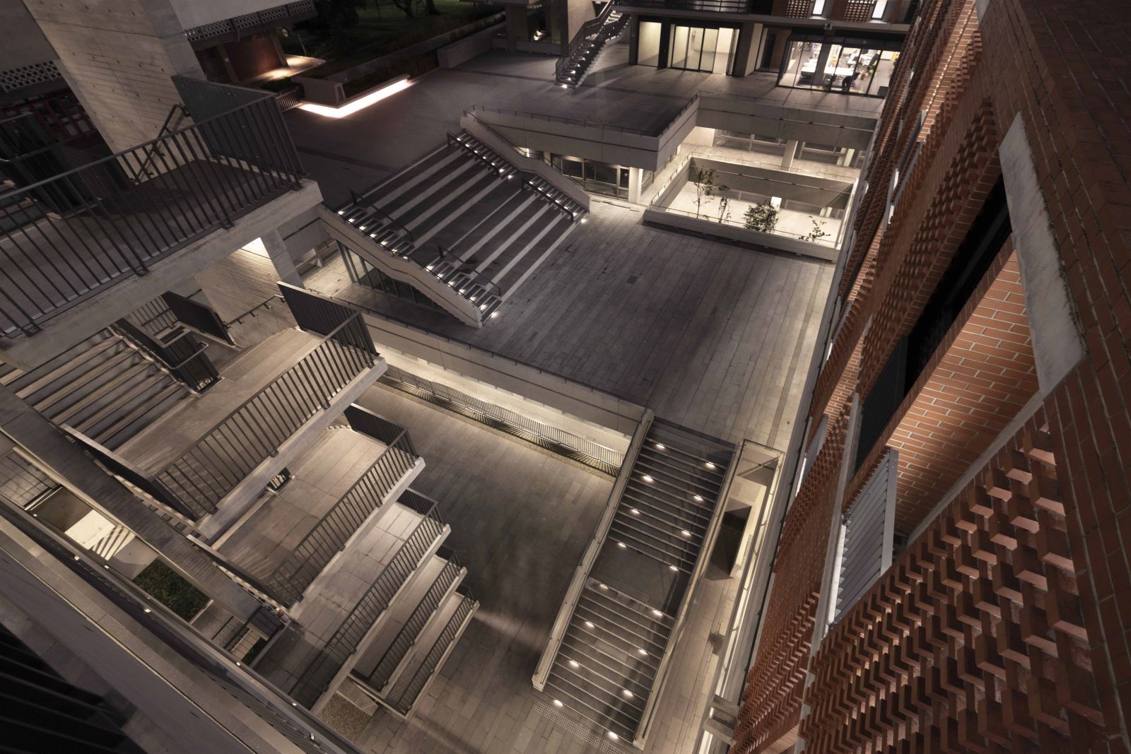 建築以四合院形式構成,中央廣場、大階梯、天井、空橋與廊道串聯起水平與垂直的流動動線。白天,陽光清晰地刻畫空間層次;夜晚,光線成為空間引導的角色,透過照明標示出上下空間穿梭的路徑與節點。主要廊道使用天花下照燈,其他水平移動空間則以低尺度、低照度照明營造放鬆氛圍。大廣場不設路燈,僅透過周遭建築內部光線為指引,維持空間視覺的開闊;大階梯邊緣則設置踢腳燈,清楚定義行進動線。戶外樓梯採用上下照壁燈,既保留杉木紋清水模材質的肌理感,也提供必要照度,達到美感與功能的平衡。