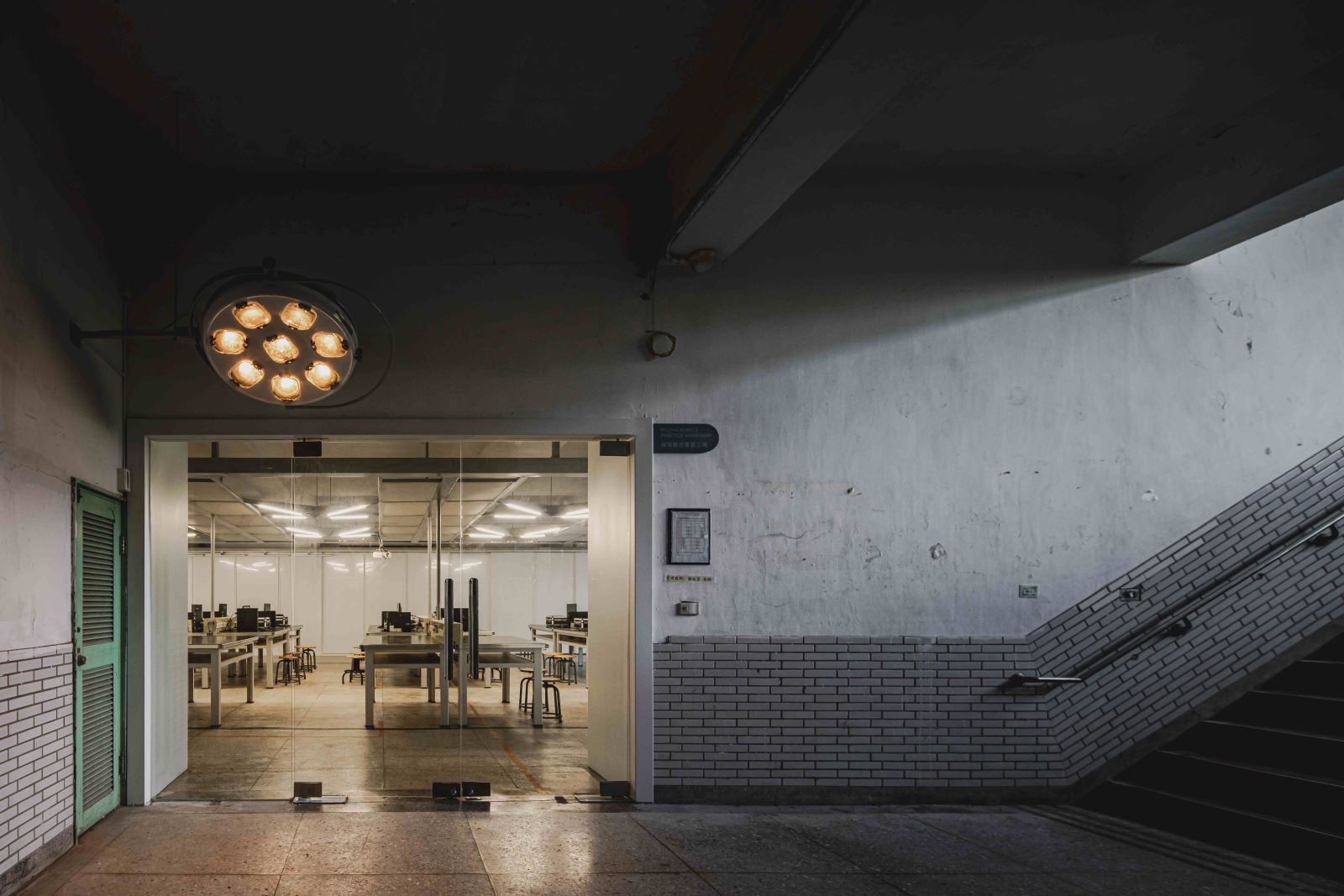 入口處特別設置一盞從舊醫療設備中轉化而來的「手術無影燈」,懸掛於走廊與教室之間的過渡區。這盞燈不僅象徵著機電教育如外科手術般的精準操作,更在心理層面上提醒使用者──進入教室即如踏入手術室,必須心無旁騖、全神貫注。它成為此空間的精神開關,喚起學生對技術的尊重與自我價值的認同。
