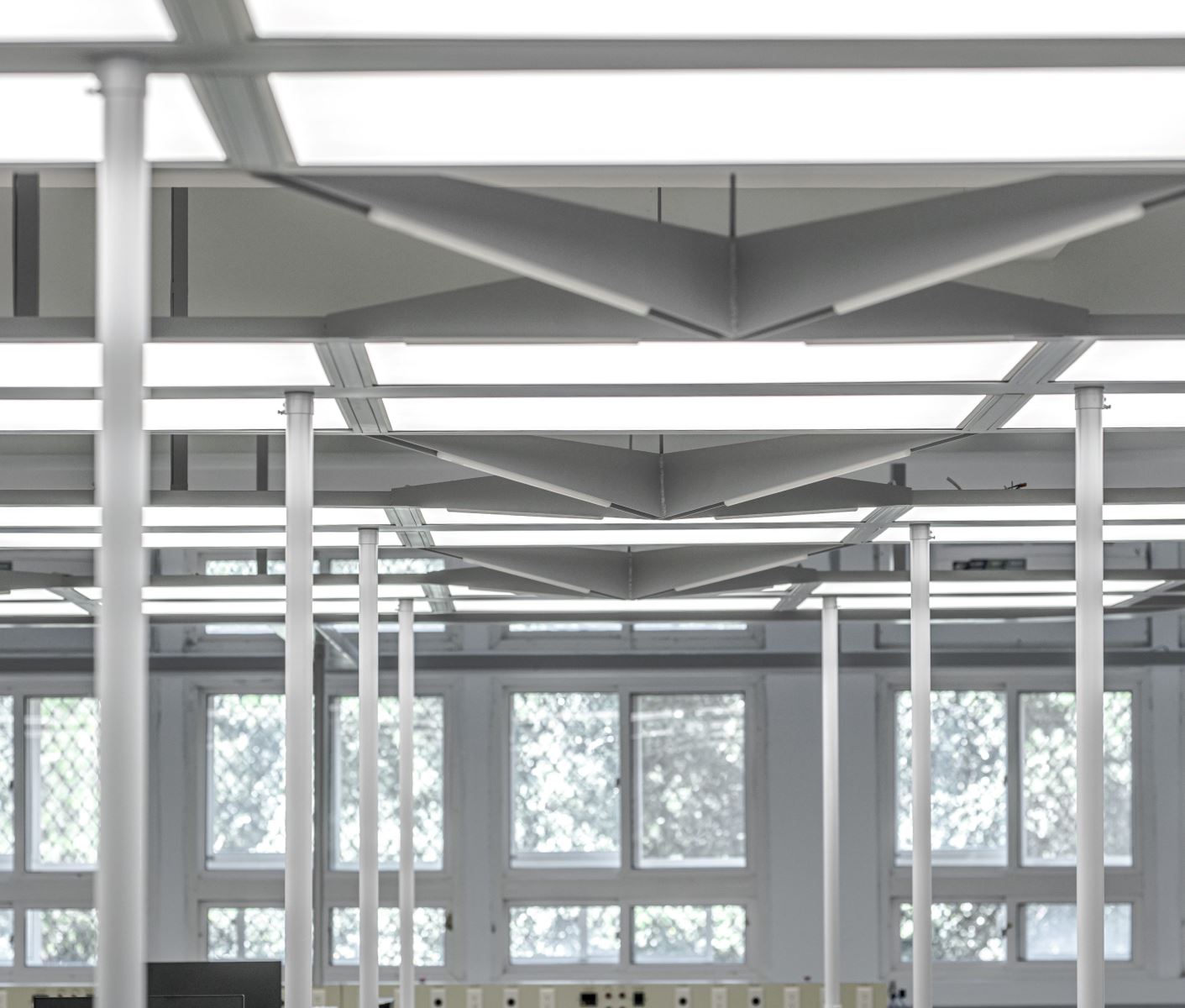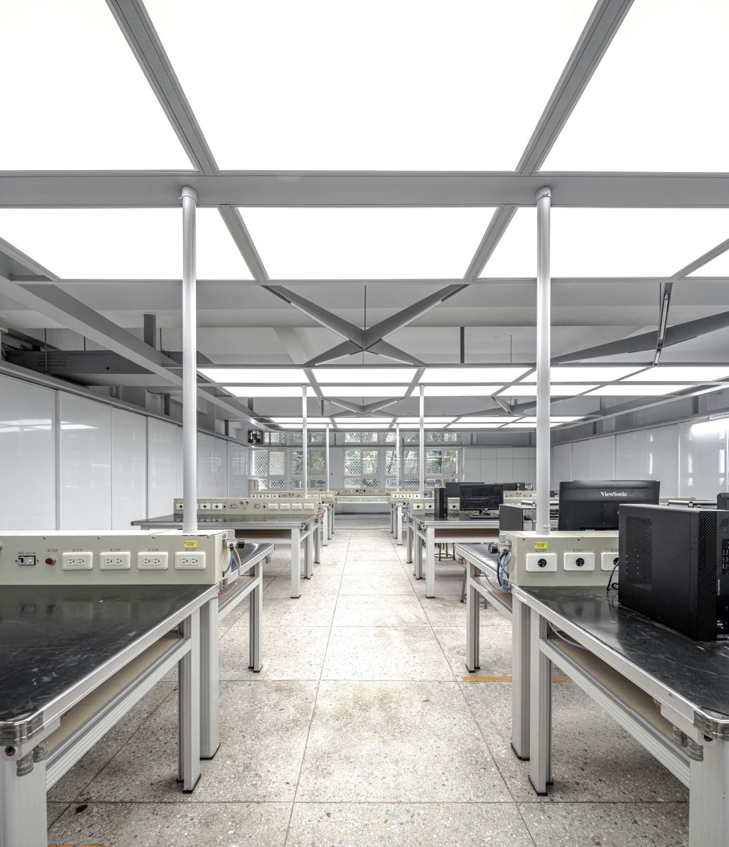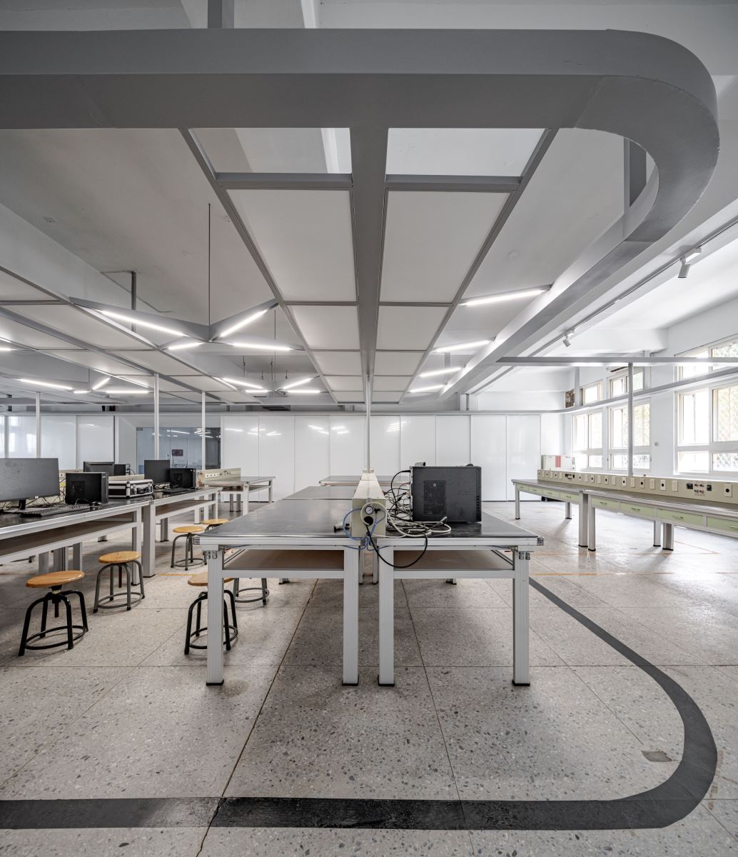 光環境的設計意象指涉醫療空間的潔淨與明亮,手術般的專注、神聖。大面積平板燈均勻撒下柔和光線,確保每一個工作桌面均有良好可視性,並輔以交錯的燈條補強走道照明,線性燈除了界定動線區,同時是天花線槽的交叉結構,創造光感均衡、視覺導引清晰的空間場景。設計團隊認為,學習技藝的過程如同手術般精密而神聖,應該被賦予一種「儀式性」。