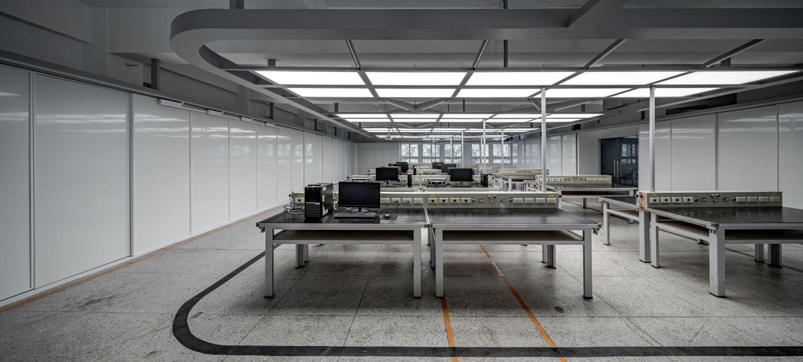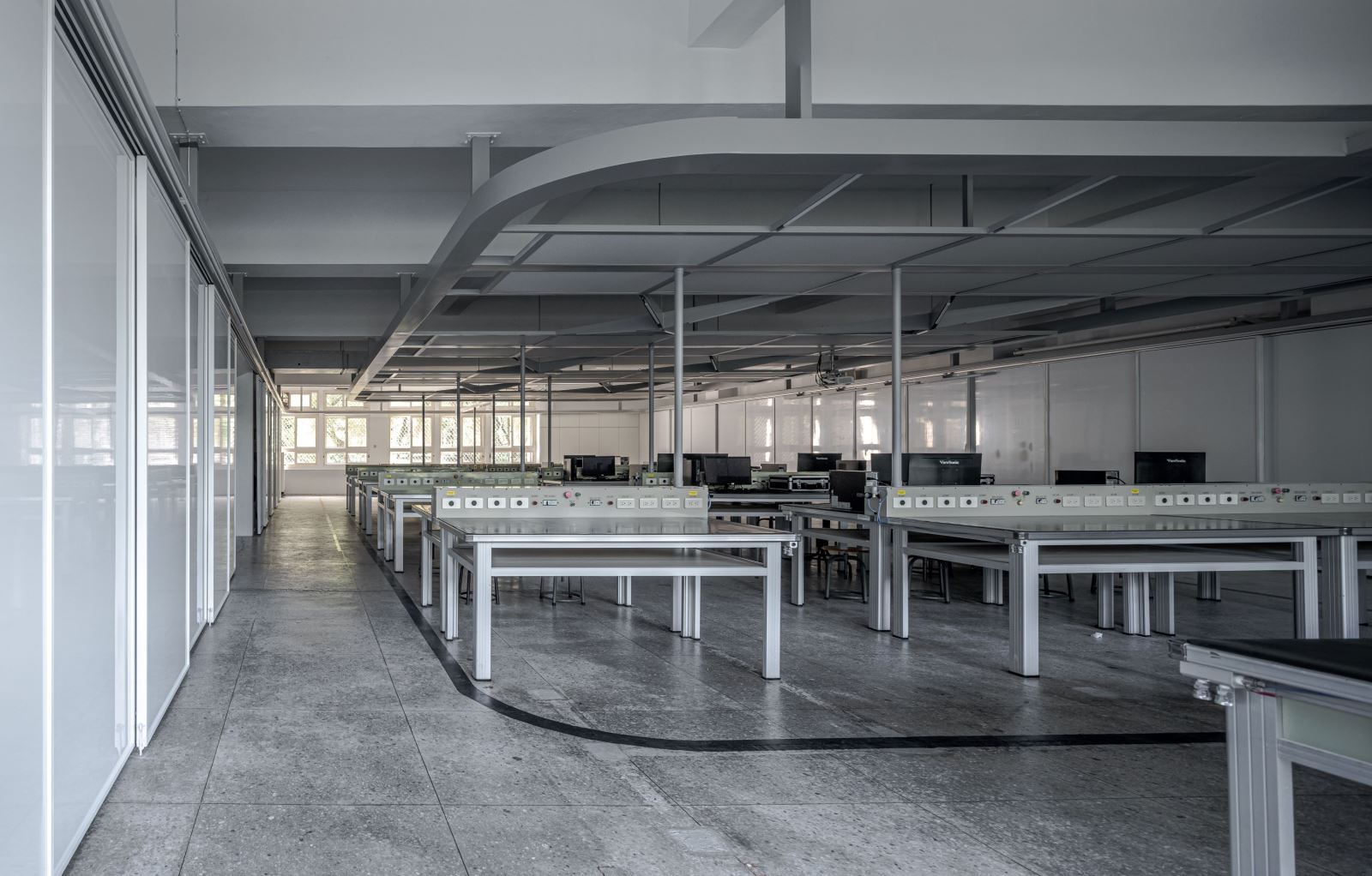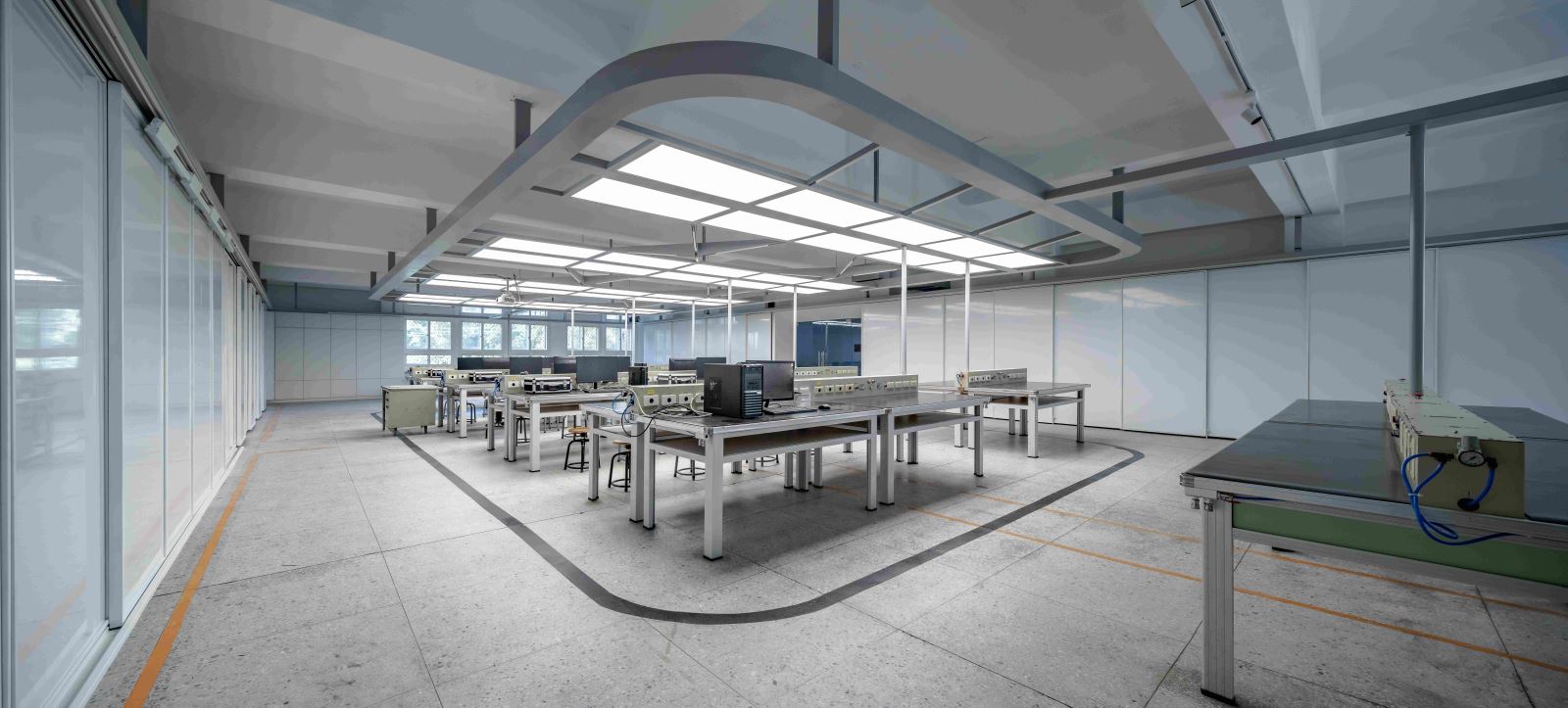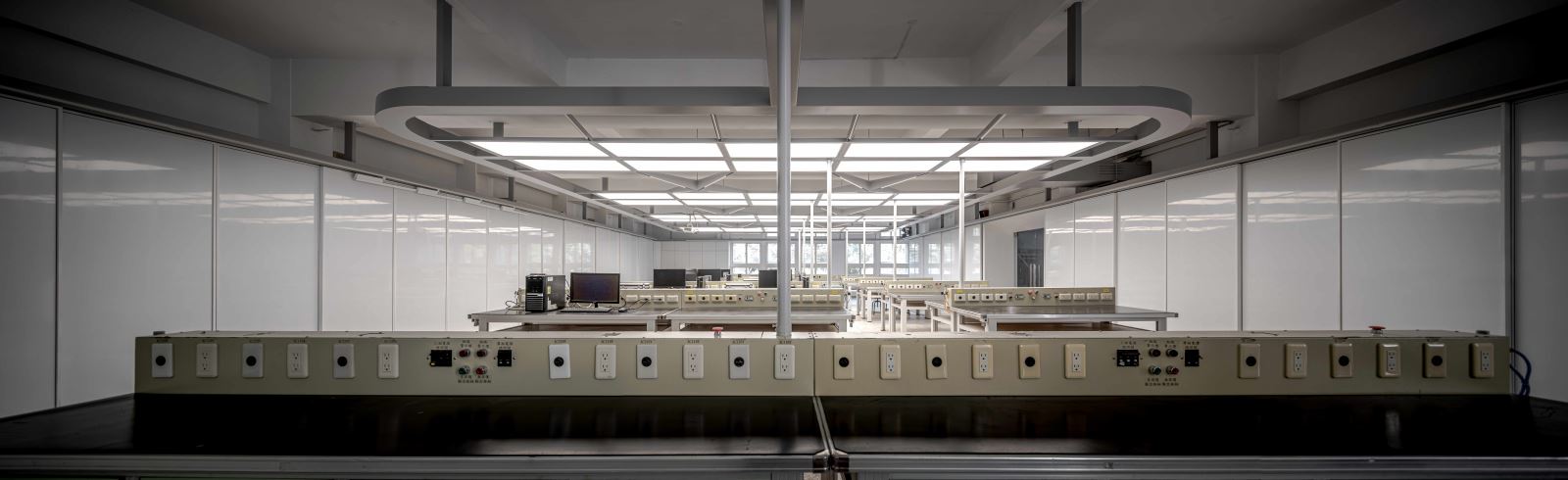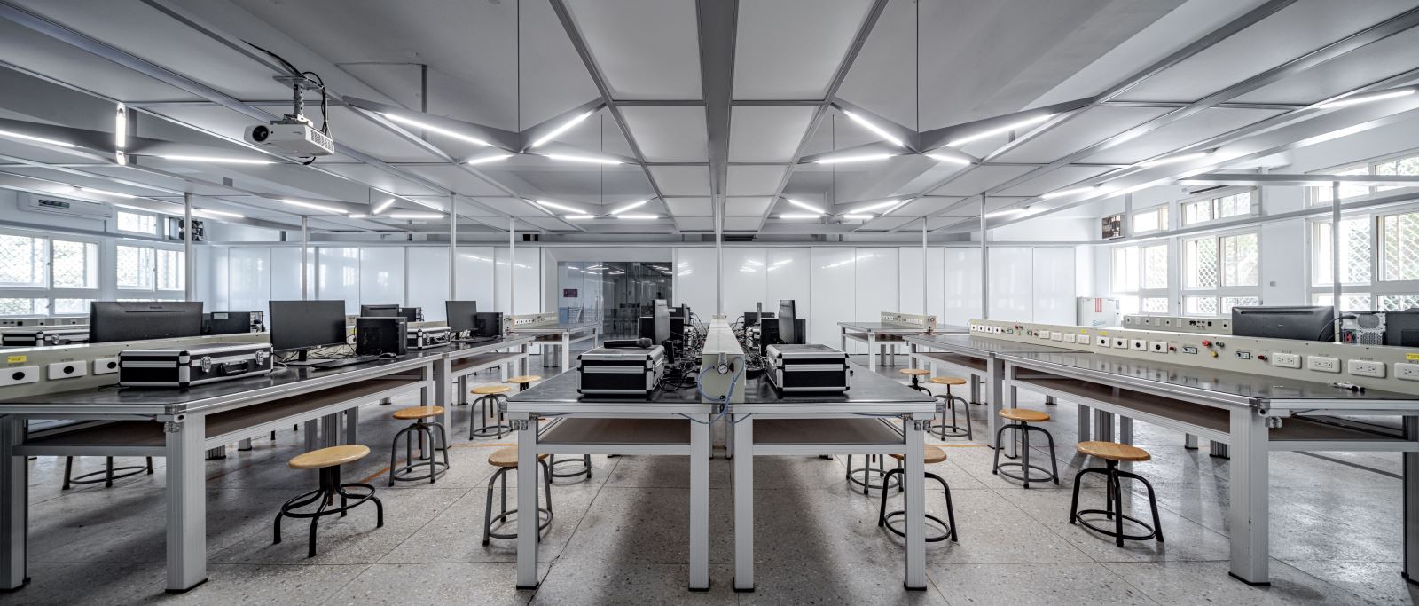 本案為職業學校之機電實作教室改造計畫,旨在原有老舊空間中注入「職人精神」場所意涵。設計團隊相信「空間能影響心靈」,將學習環境從原本僅具實用性的教室空間,轉化為具有秩序感與精神象徵的現代教學場域。改造策略導入「雙環系統」概念,外圈整合收納與展示機能的外環滑門系統,內圈以環形吊架規劃照明與線槽結構,清楚劃分領域。燈光設計以平板燈與交錯光條呈現清晰、均勻而聚焦的光環境,操作桌上有平整俐落的平板燈,走道則輔以交叉燈架,提供結構支撐外,也補足走道區域的照明。以光來定義領域,寓意學習過程中的專注與技術的神聖性。透過系統性的設計語彙,本案不僅提升實作效率與教學品質,更讓學生於其中感受到自身技藝的價值與自信。