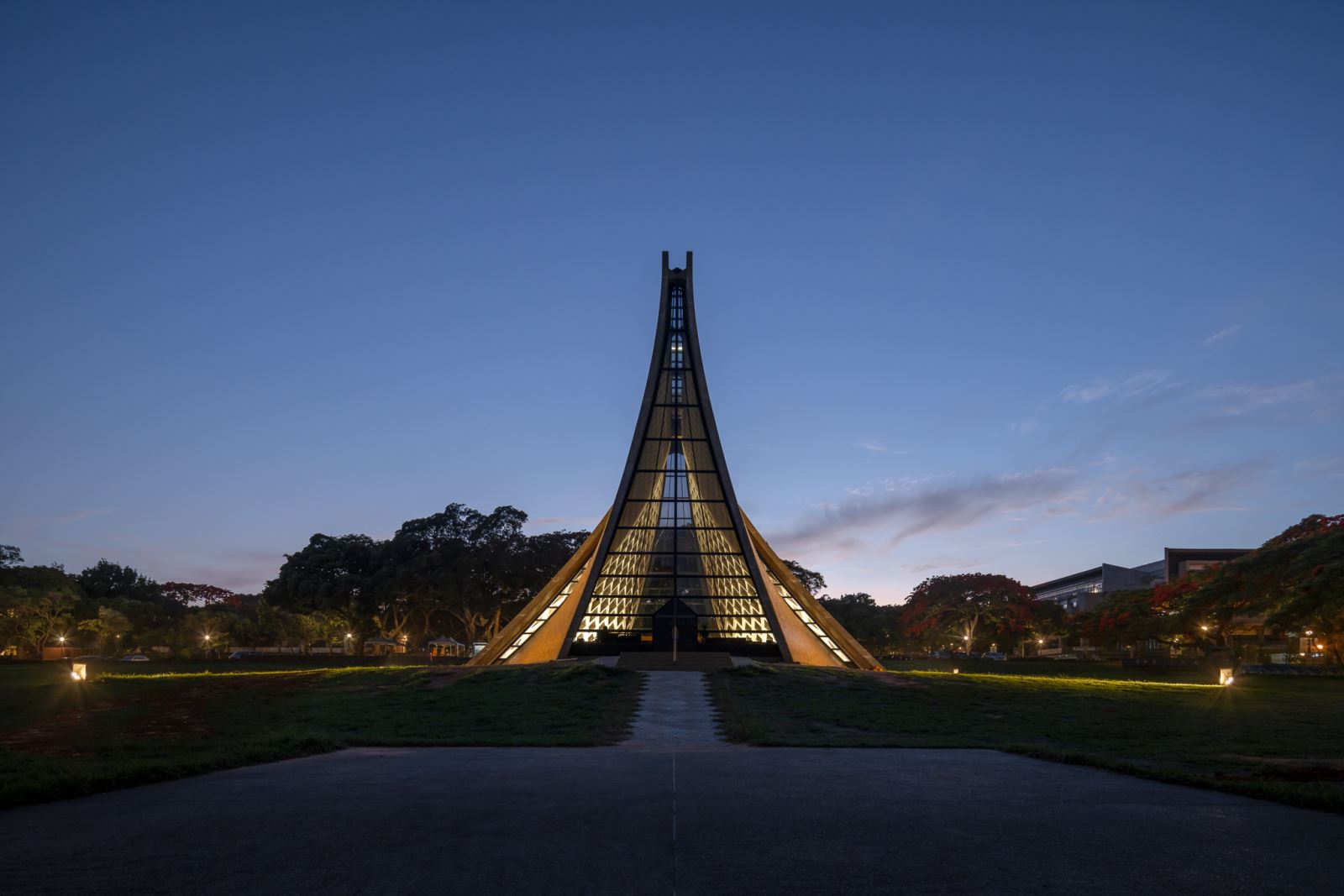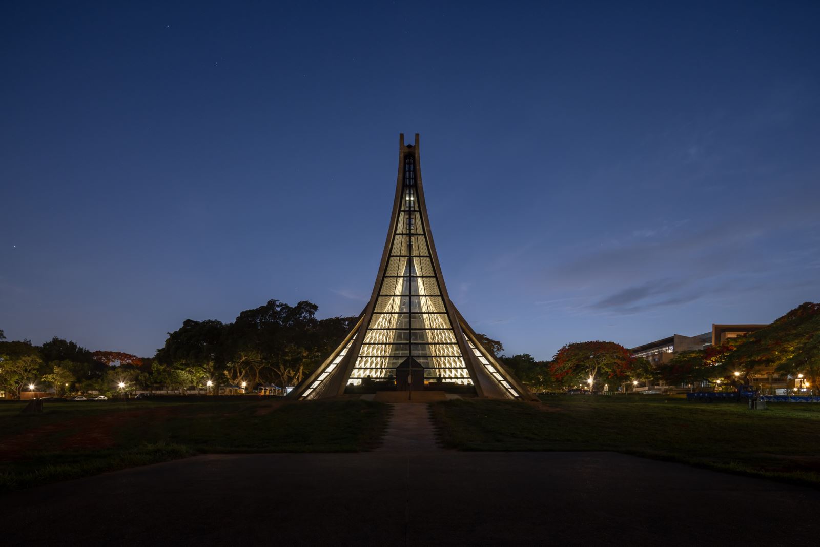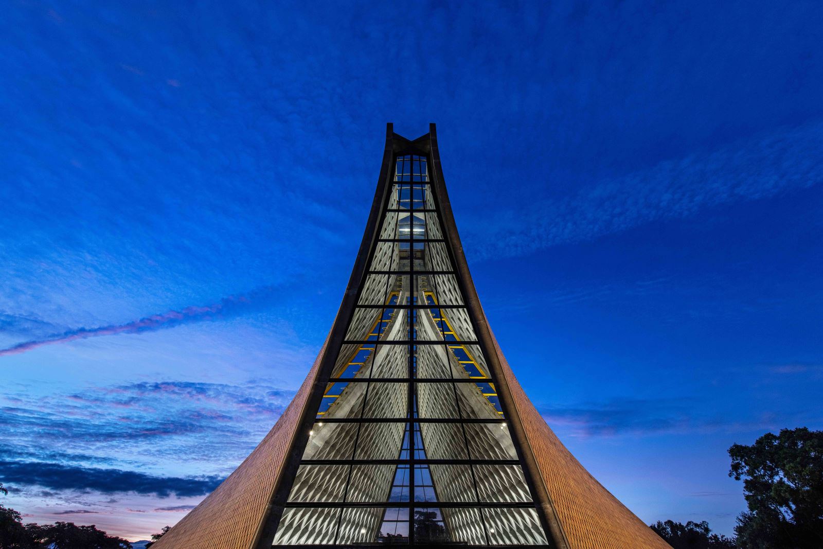 路思義教堂為臺灣現代建築經典,位於東海大學校園核心。其獨特的四片雙曲面構造與宗教象徵性構成極具精神性的場域。本次照明設計修復計畫,旨在尊重建築原構想與靈性氛圍的前提下,導入現代光環境策略,使光線成為建築與信仰間的靜默媒介。