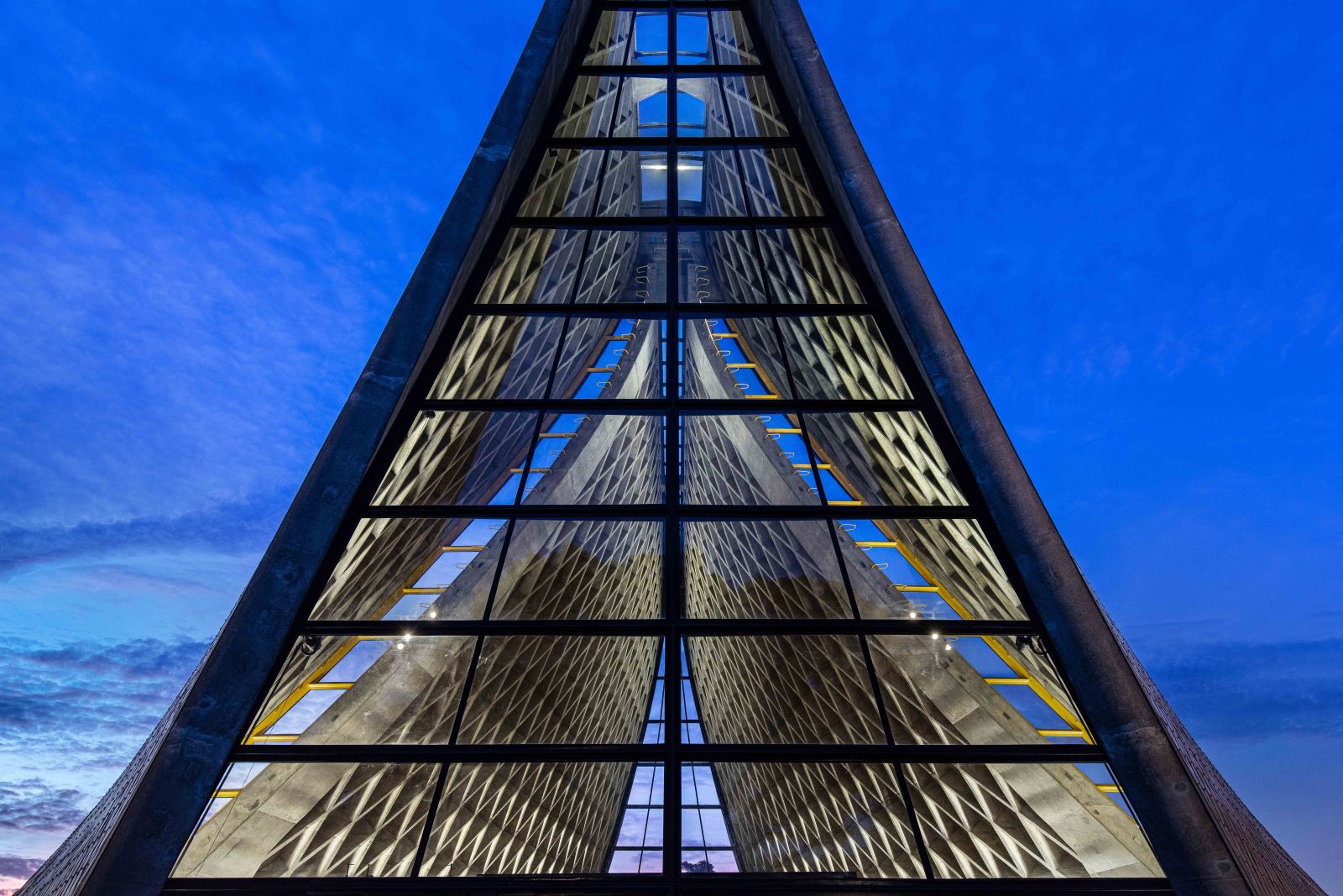 建築本體由四片三度曲面板構成,形似倒置船腹,上寬下收,予人沉穩厚實之感。屋脊分離並設玻璃天窗,營造「一線天」意象;側窗溢入斜光,為室內增添神祕韻味。從正立面或四十五度角內視,流暢曲線之美尤為動人。