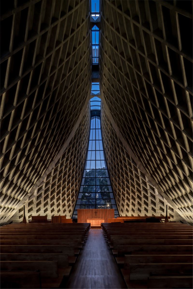 在感受與體驗層面,室內燈光以柔和色溫營造敬虔與沉靜氛圍,使用者無論禮拜、祈禱、獨處皆可沉浸其中。白日自然光由十字窗與高牆溢入,夜間則轉為室內暖光緩緩托起空間,使整體不僅具靜默包覆性,更添溫度。外部照明讓教堂成為植物環繞中的一抹光影剪影,遠觀十字架浮現夜空,近看建築紋理層層堆疊,彷彿訴說信仰與建築交織的故事。