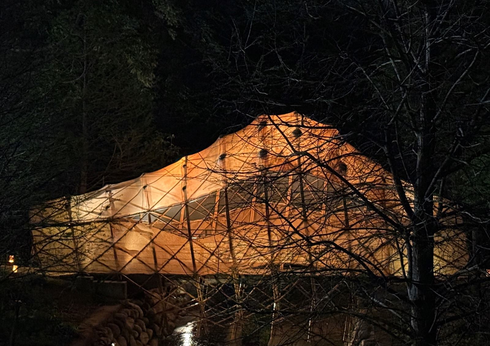 光環境也將『⽩天』納入『⾃然⽇光』考量;陽光從落⽻松縫隙間傾瀉,層層透射於⽵紙與透光布構成的⽪層,使光影如⽔波起舞,樹影與湖光交織,映在⽵構曲⾯表層,編織如森林薄霧詩意畫卷。⾏⼈步履與光線共鳴,光影層層變換,彷彿⾃然與光的低語賦予靈動⽣命。
