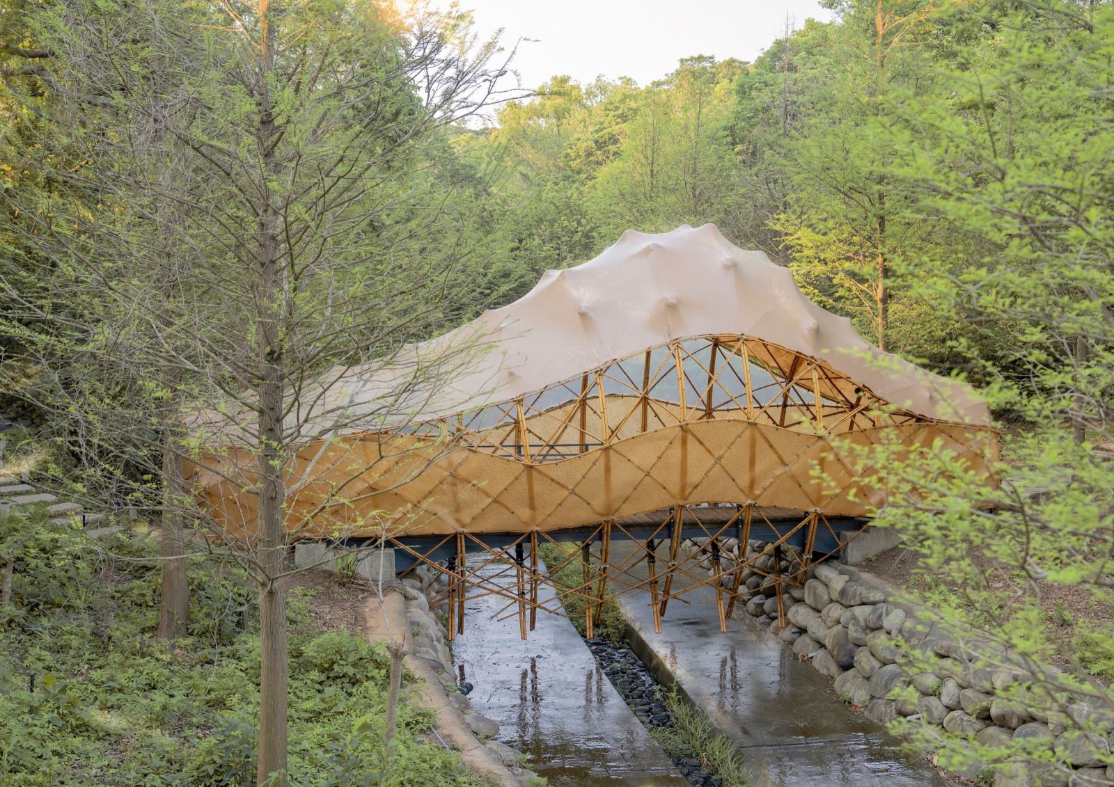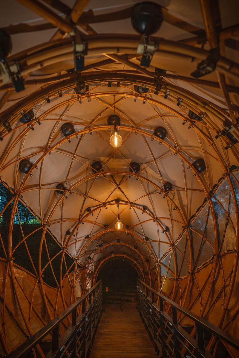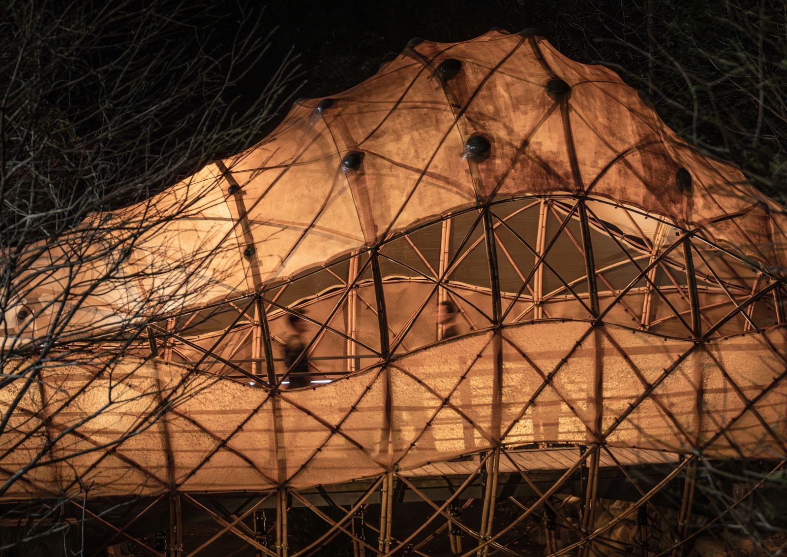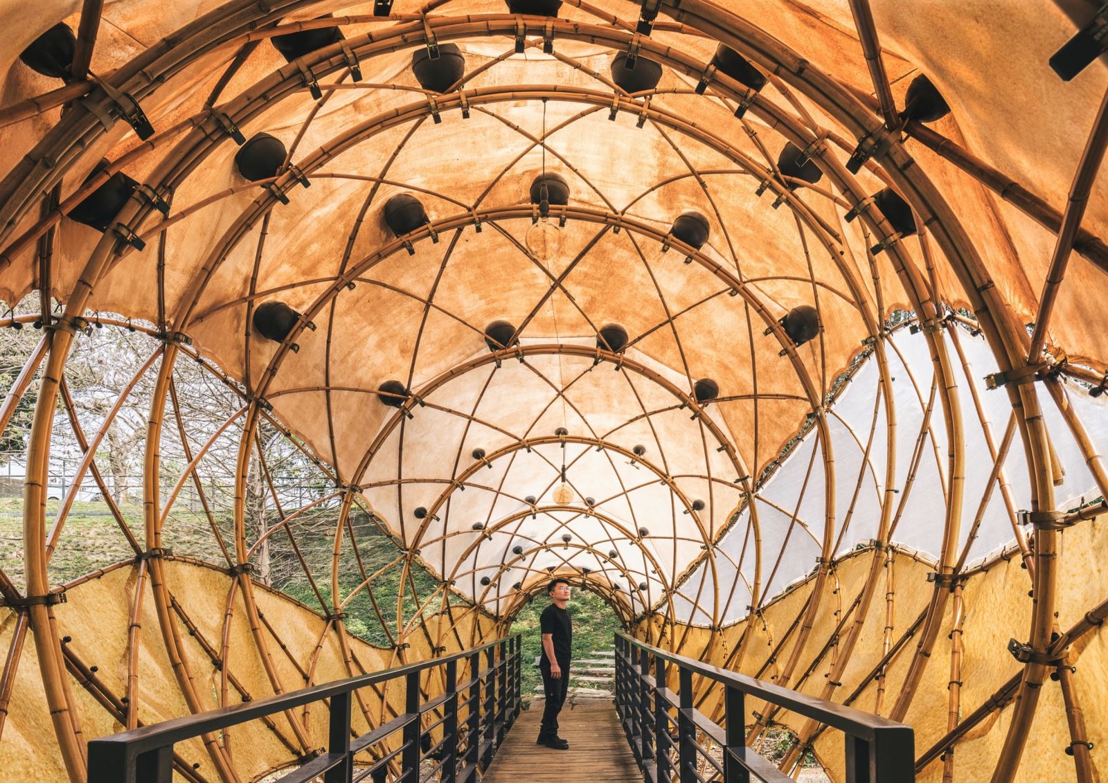 在陽明交⼤落⽻松湖畔⼀座如蟲繭般依附於秘境⼩橋的⽵構築《橋繭》,由森林⽊⼈建築⼯作室設計與親⼒親為施作,獨創「蒸氣彎⽵」⼯法,創造近360⽔滴狀弧形⽵拱。⼗⼆組螺旋拱由低矮入⼝⾄橋央六米⾼拱殼,步伐隨之由彎⾝⾄抬頭,仿若破繭⽽出。⽵構無釘,僅以綑綁器具靈活固定,未來可全拆解回歸⼤地,體現材料友善與循環永續。