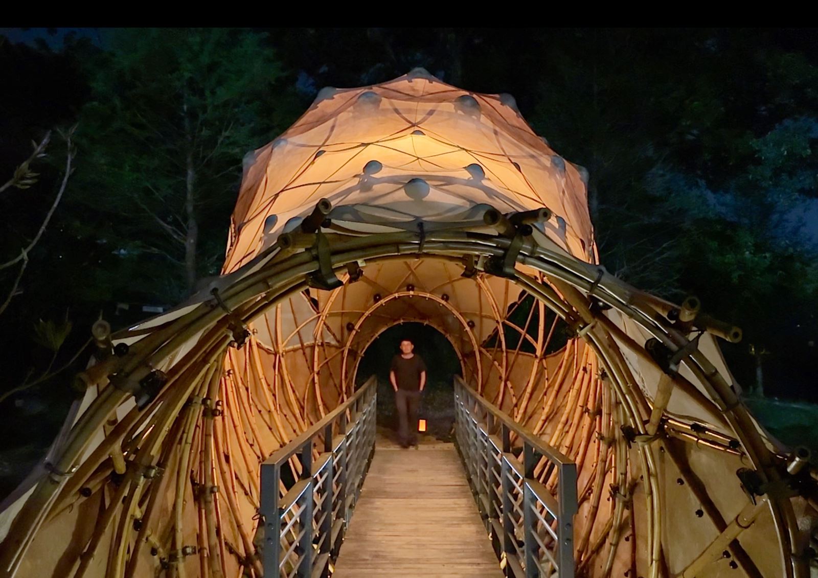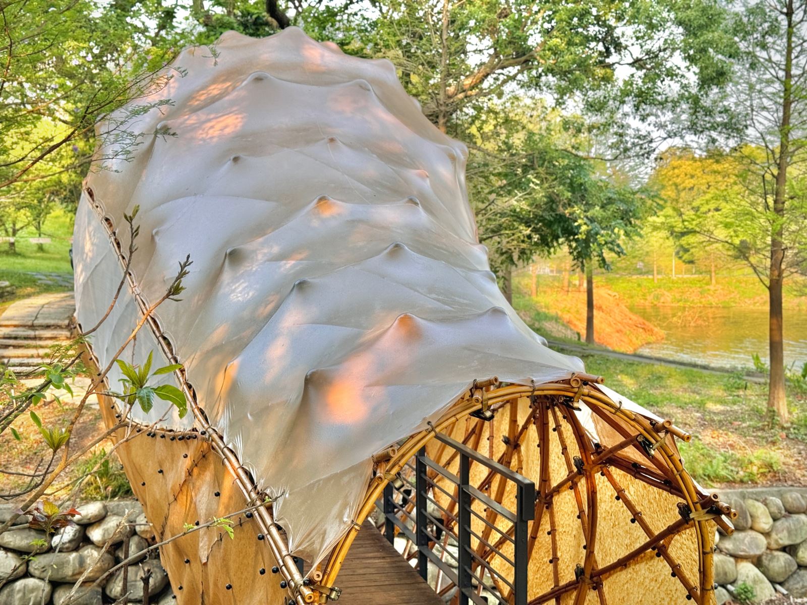 在陽明交⼤落⽻松湖畔,⼀座如蟲繭般依附於秘境⼩橋的⽵構築,名為《橋繭》,由森林⽊⼈建築⼯作室設計與親⼒親為施作,獨創「蒸氣彎⽵」友善⼯法,創造360°⽔滴狀弧形⽵拱體。⼗⼆組螺旋拱從低矮入⼝到橋央六米⾼拱殼,步伐隨之由彎⾝⾄抬頭,仿若破繭⽽出。⽵構全無鐵釘螺絲打穿,僅以綑綁器具靈活固定,展後可拆解回歸⼤地,體現材料友善與循環永續的理念。
