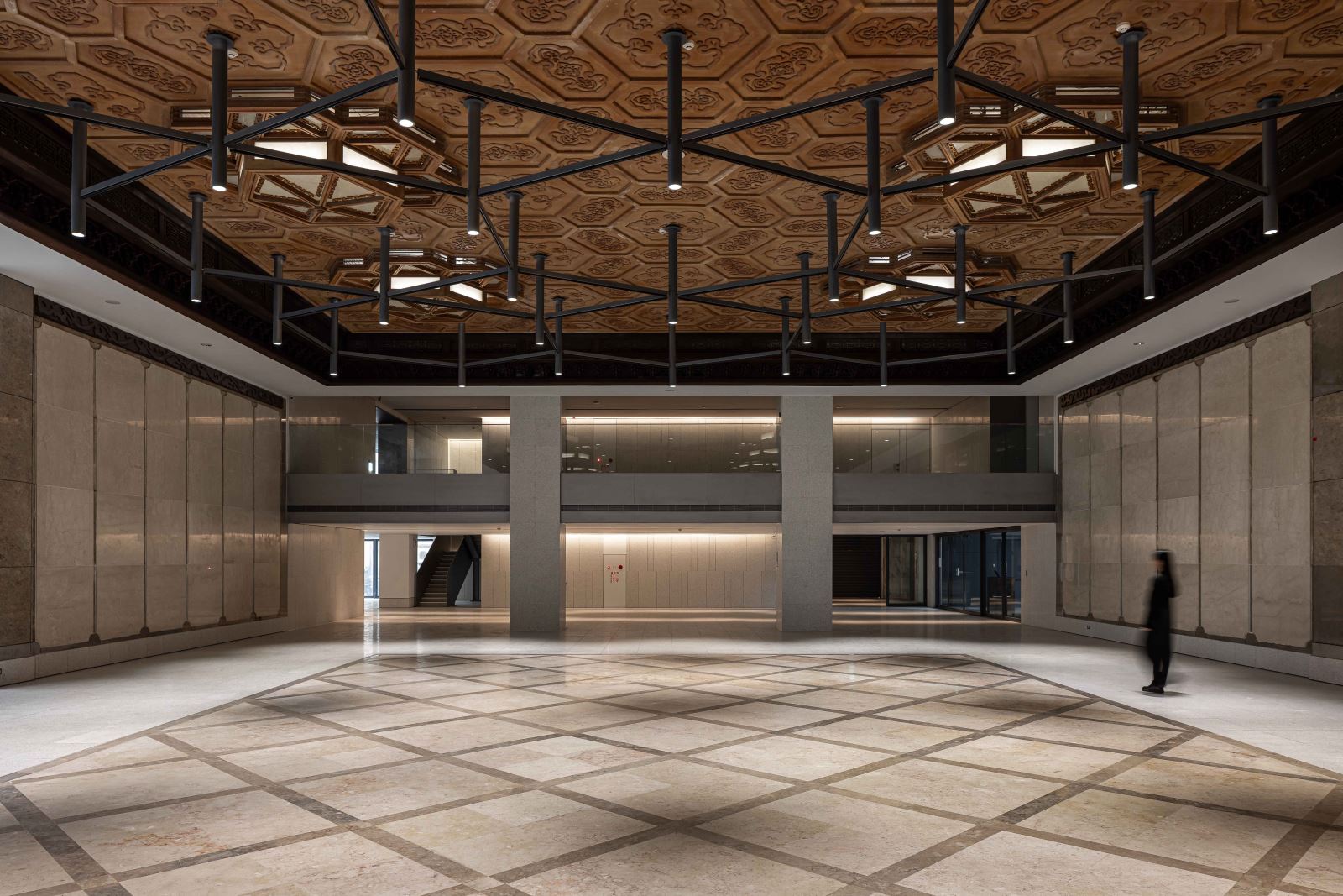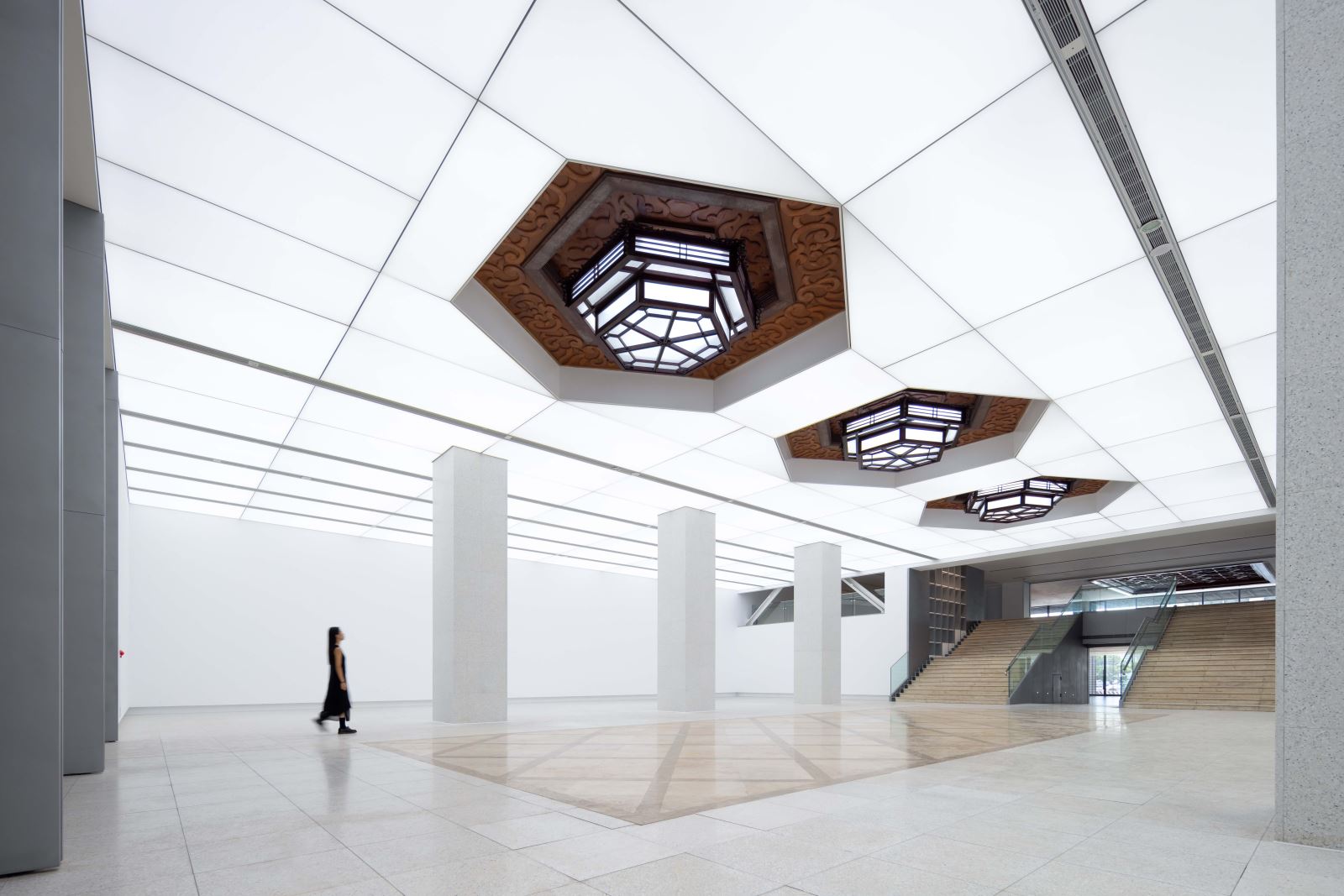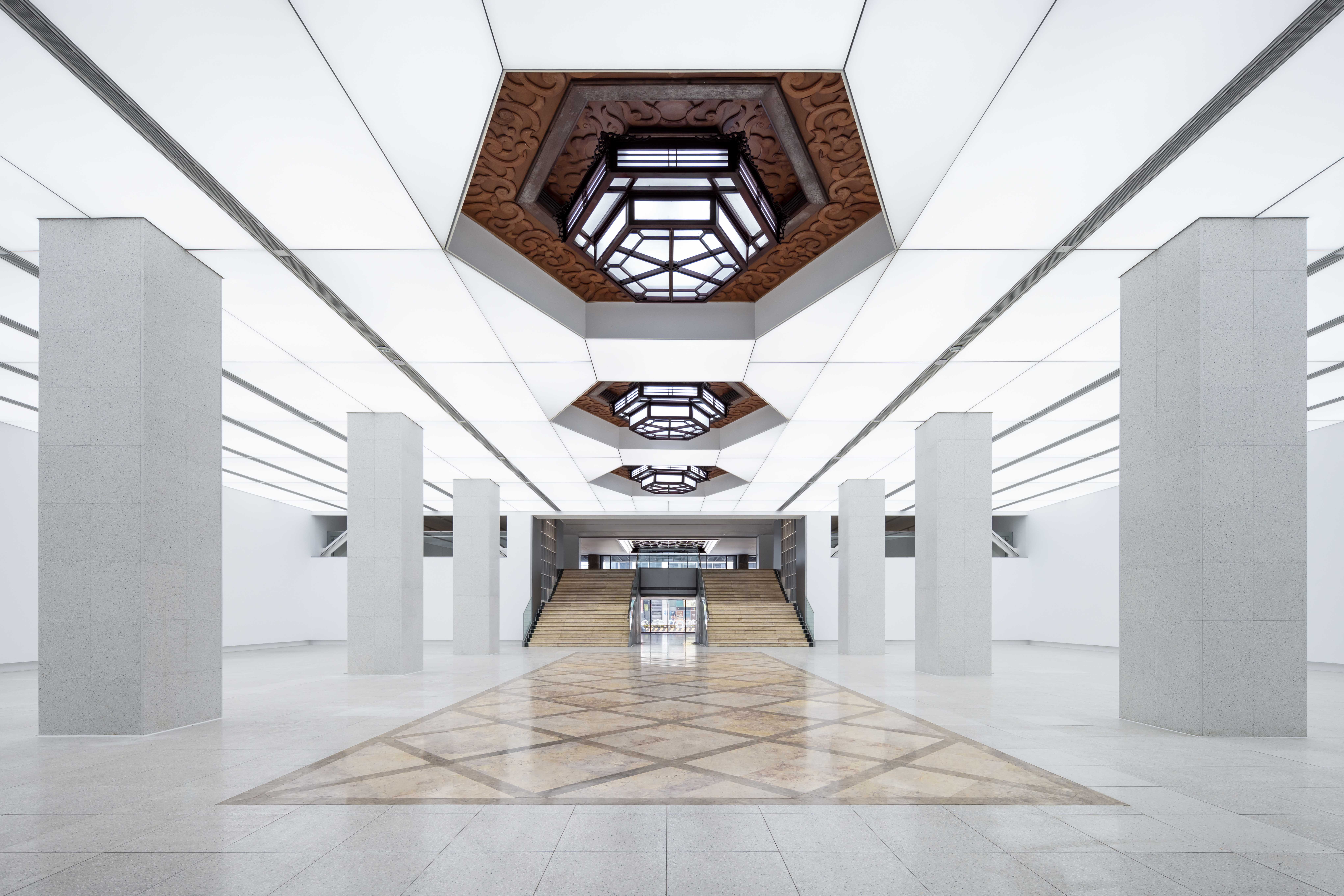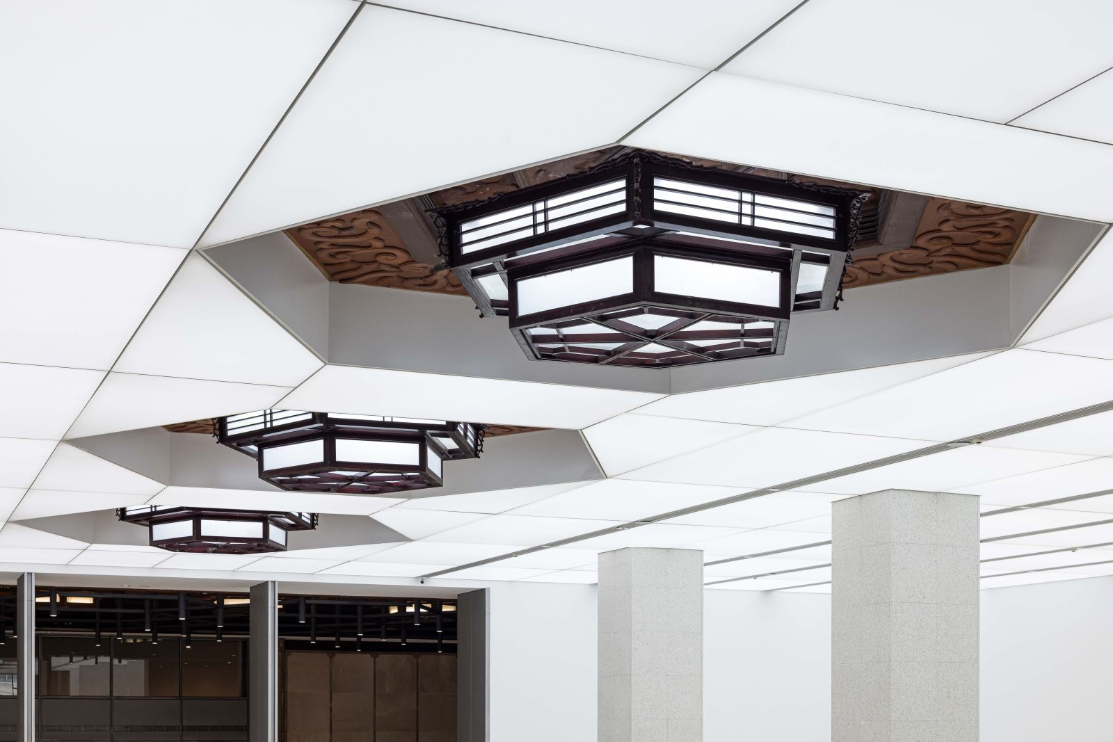 光膜照明系統以智慧控光為基礎,搭配軌道燈可依不同展覽彈性調光;空間改造後仍保留的歷史宮燈,除延續文化記憶,讓現代光環境形成時間層次的對話。