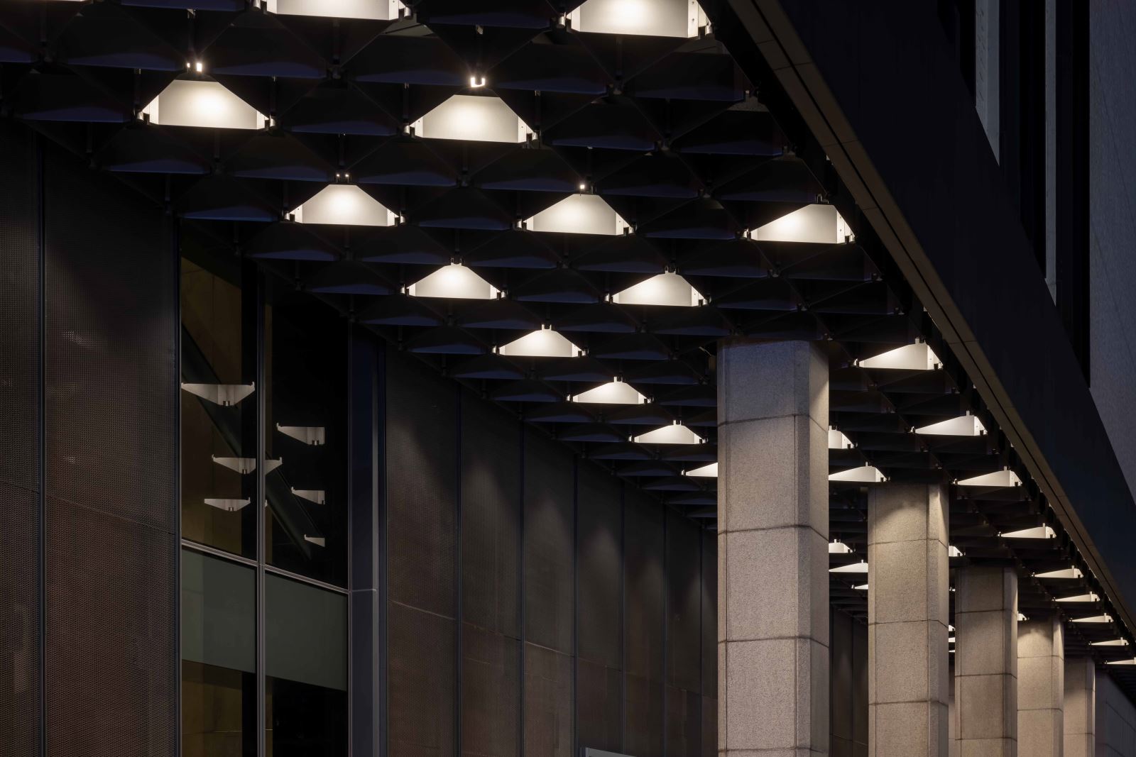整體照明採高效能 LED 燈具,搭配可調式控制系統,依時段與展演需求自動調整照度,有效降低能耗與燈具損耗。燈具與光膜系統皆為模組化設計,具備可維修與更換性,延長設備生命週期,亦減少長期維護成本。設計並於自然採光良好區域預留光源參與,減少日間人工照明使用,實踐能源整合利用。