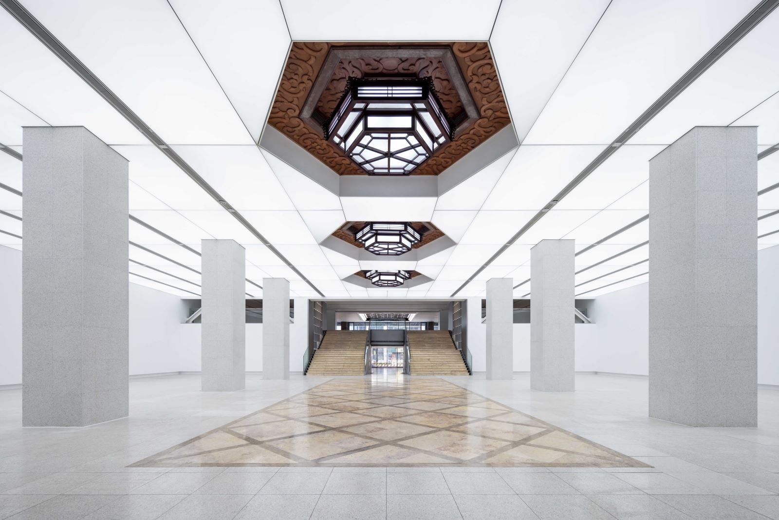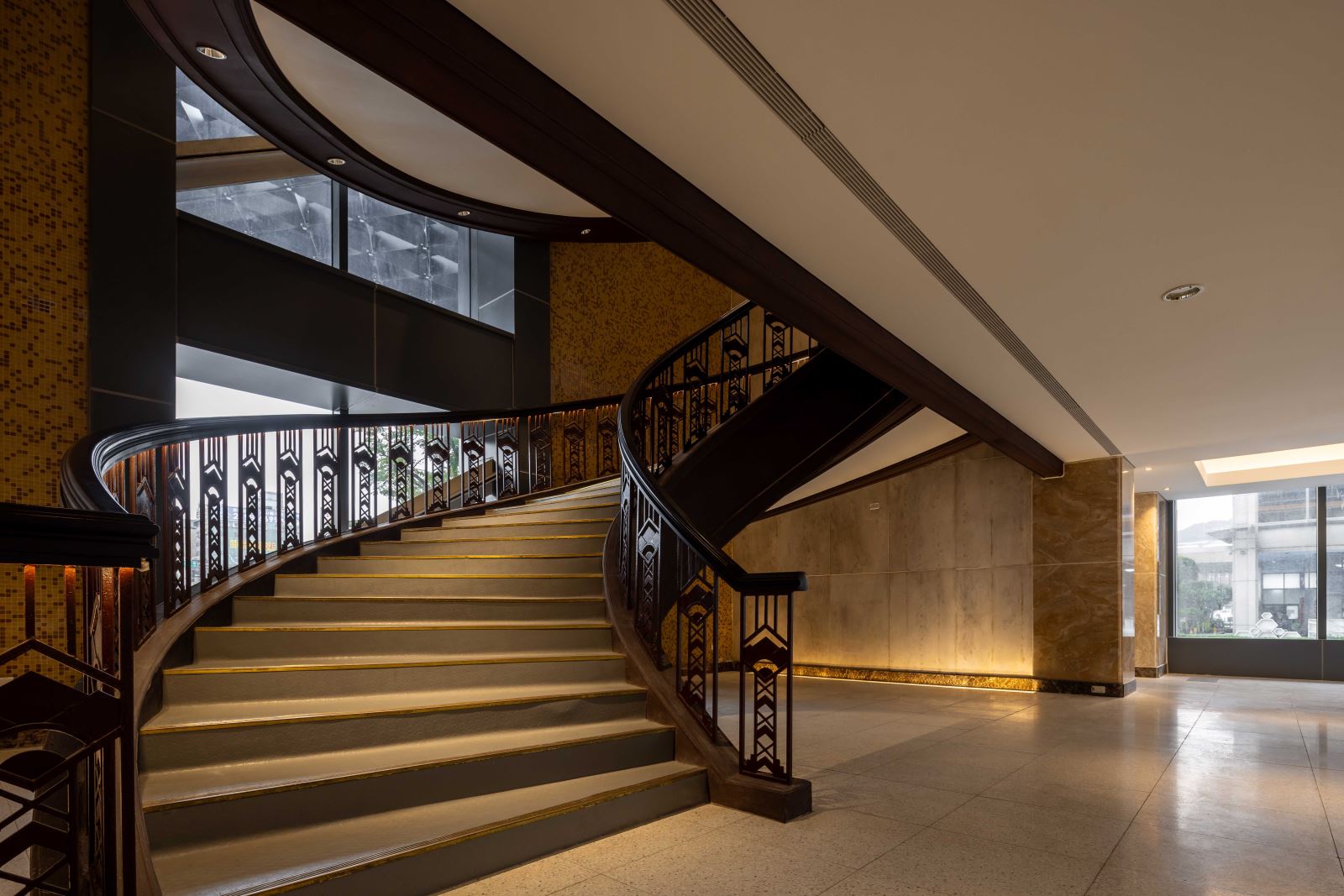 團隊依各區域歷史語境與空間機能,發展對應的照明策略與配光形式。從復古氛圍的歷史宮燈、模擬自然光的光膜天花,到具調光功能的展軌燈與洗牆燈,形塑多層次的光影節奏。燈具配置亦講究材質光澤與反射特性的搭配,展現光於建材肌理中的藝術表現,使光不僅具功能性,更成為建築語彙的延伸與再創。