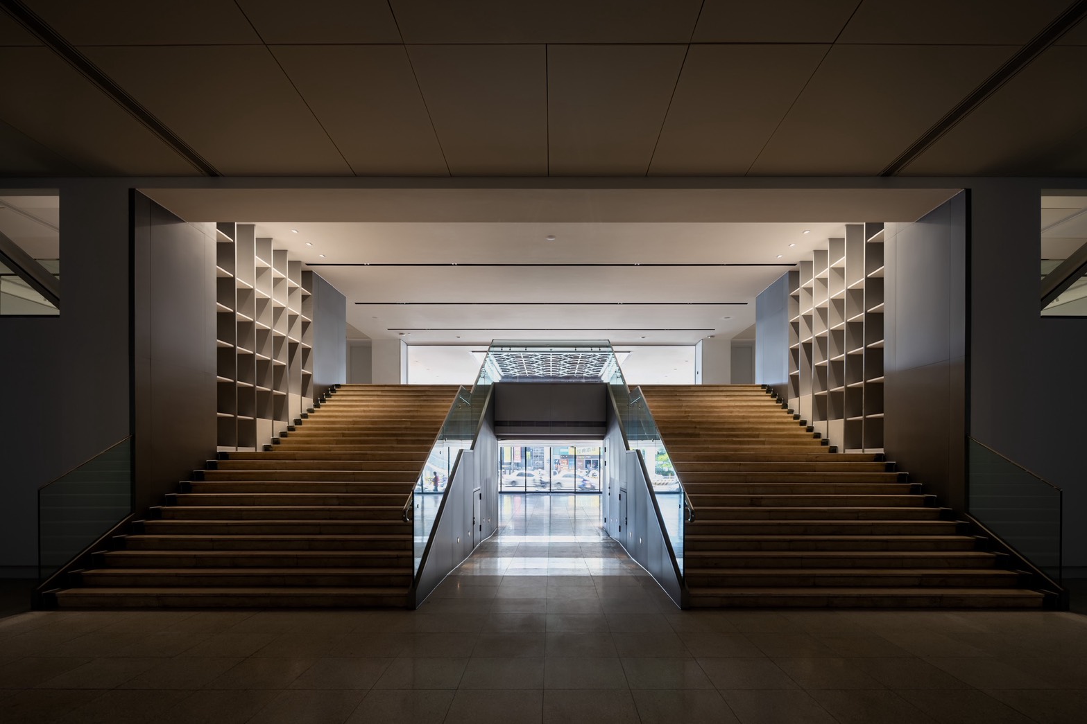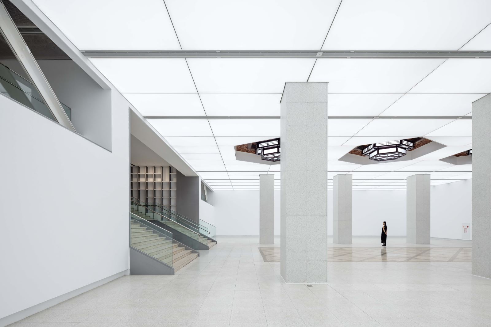 入口大廳採用 4000K 中性光,呼應建築挑高尺度與白色立面,營造莊重且親切的迎賓氛圍,亦作為通往主展區的光感過渡與隱性引導。主展區導入 5000K 高色溫的光膜天花,提供接近自然日光的清晰光感,並搭配展軌燈與智慧燈控系統,實現彈性策展條件。後區展間鄰近大面窗面,自然光充足,室內則配置 4000K 與 3000K 光源,以平衡自然光與人工照明的感知落差,並於螺旋階梯等空間節點加強光影層次,提升空間辨識度與動線引導。