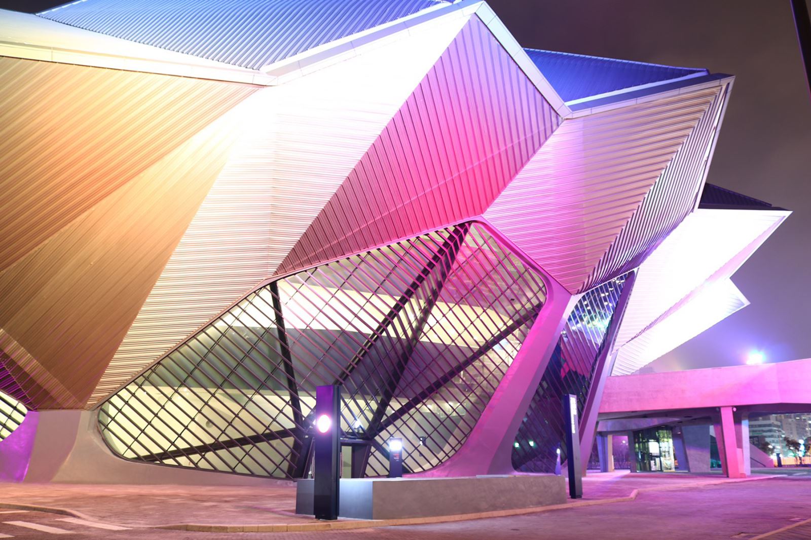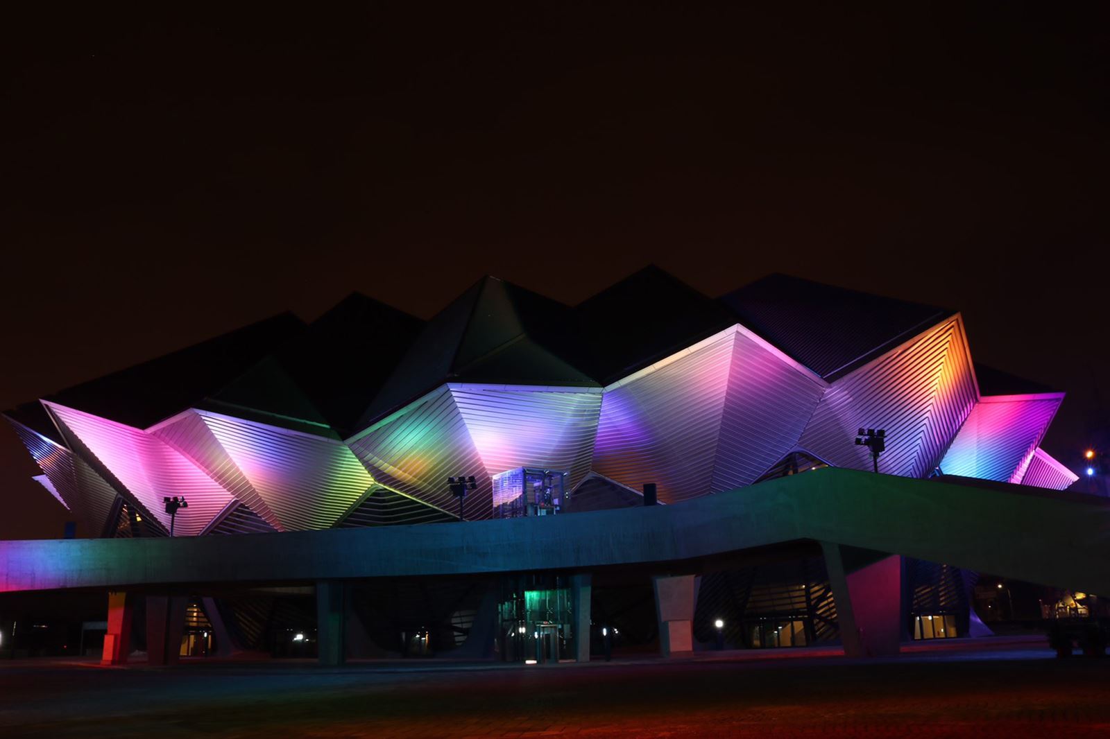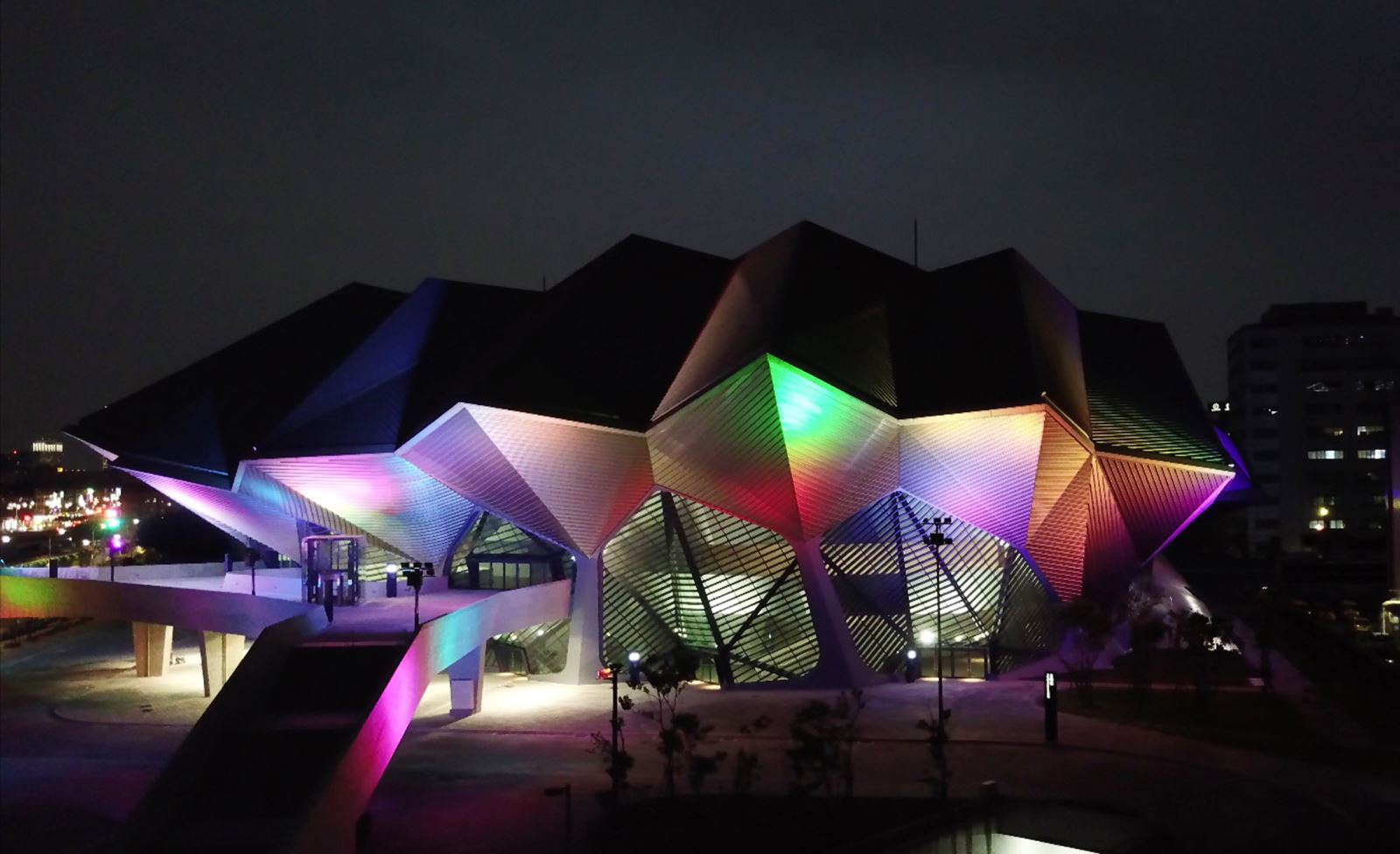 這是主要室內表演的場館,場館以鋁板外殼包覆整個室內表演空間,鋁板外殼造型特殊,型塑如舞者的裙擺,裙擺下方為入口大廳,室內大廳由室內透光透過大廳玻璃外牆至室外,再以LED RGB調光變色投光燈打在裙襬下方,再配合中央控制系統由DMX指定時間控制,永續及人性化的節能計畫裝置,使基地周圍的光環境得到友善的處理,雖為流行音樂中心,但其光環境的處裡仍應尊重周圍公共設施機能的協調,在主廳館屋頂不再做過多的照明強調,將照明計畫內容移至裙襬下方。