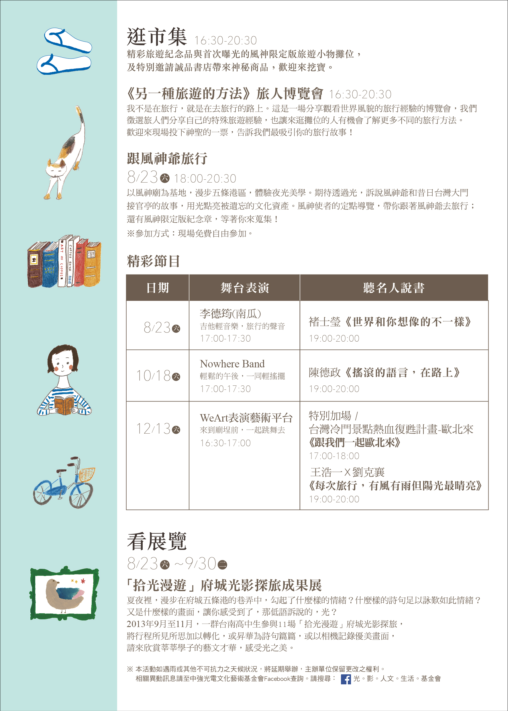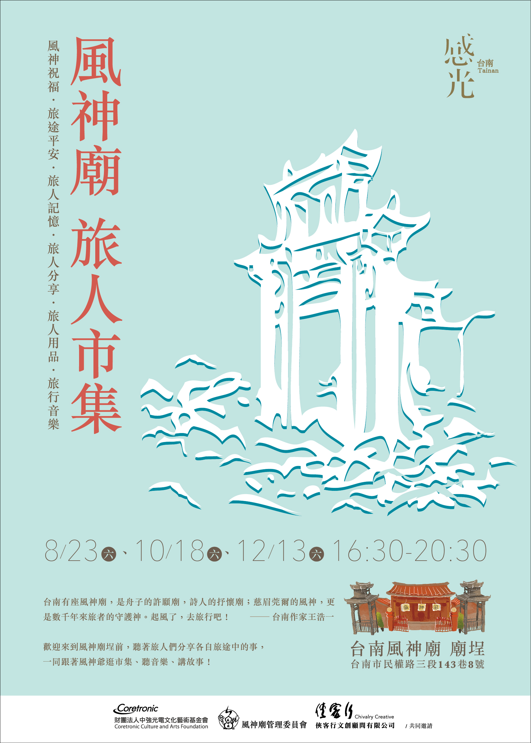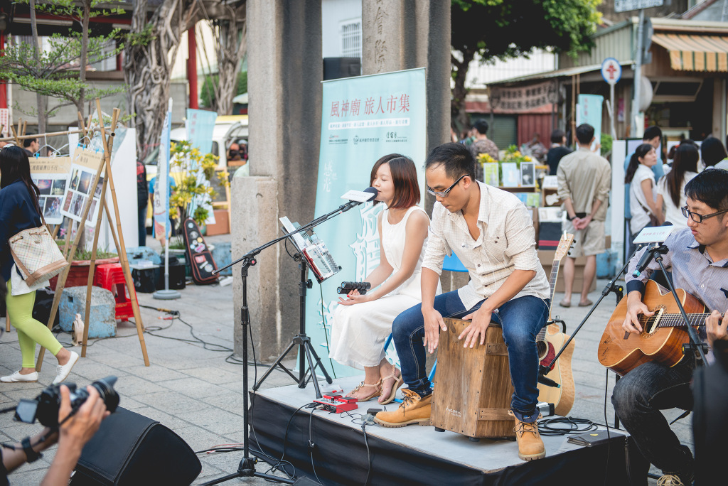 「旅人市集」集結在地文創能量與人文特色,融入各式元素,包括名人廟埕開講、旅行音樂表演、旅遊達人分享,徹底顛覆以往廟會活動模式,以嶄新的廟口文化維繫人與人之間的感情;另外,更邀請年輕人用手作創意表達對古蹟的珍惜,讓更多喜愛台南文化的朋友把風神廟的故事傳唱下去。