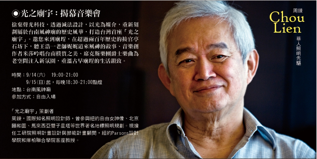 捨棄聲光科技,透過減法設計,以光為媒介,重新刻劃屬於台南風神廟的歷史風華,打造台灣首座「光之廟宇」。邀您來到廟埕,在超過兩百年歷史的接官亭石坊下,聽王浩一老師娓娓道來風神的故事、音樂創作者米莎吟唱台南樸質之美、席克斯樂團爵士樂曲為老空間注入新氛圍,重溫古早廟埕的生活韻致。