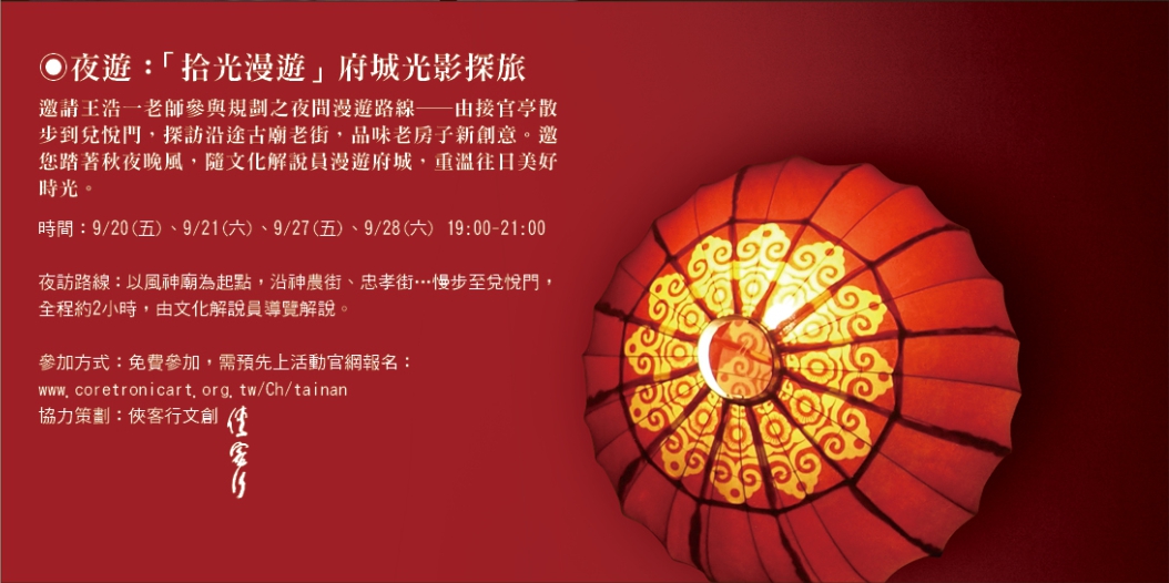 邀請王浩一老師參與規劃之夜間漫遊路線—由接官亭散步到兌悅門,探訪沿途古廟老街,品味老房子新創意 。邀您踏著秋夜晚風,隨文化解說員漫遊府城,重溫往日美好時光。